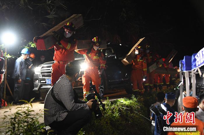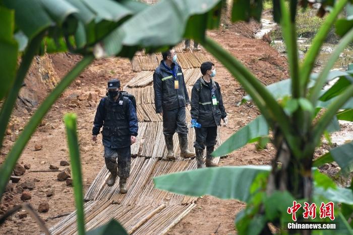 坠机事故现场下雨 工作人员铺设竹排小道