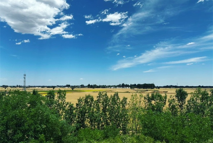 • 一望无际的麦田,呼啸而过的高铁,相互交织,谱成一首协奏曲。桥墩托举钢轨到天空,高铁奔跑在蓝天白云里。(投稿:黄勇)