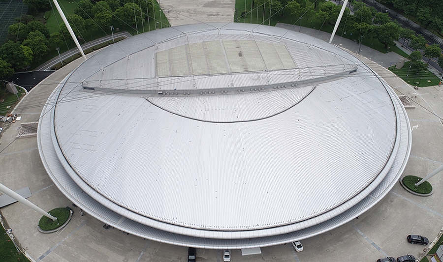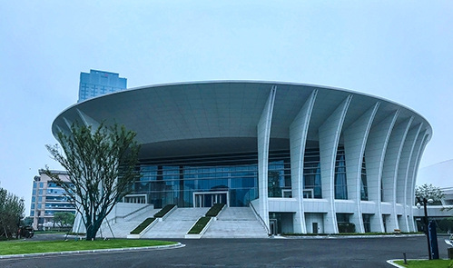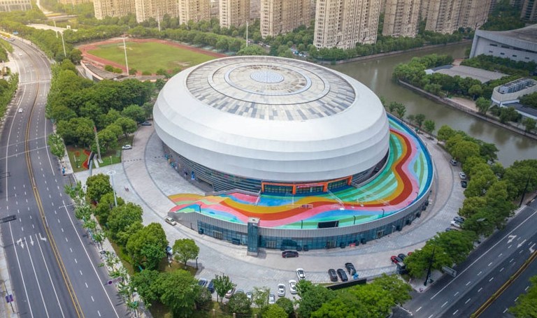 绍兴奥体中心体育馆为亚运会篮球项目比赛场馆,位于绍兴市越城区,在亚运村东南方向且相距约38.8公里。总建筑面积72010平方米,观众席位数9552座。场馆圆形的外壳,规则的银灰色流线型线条,像是江南水乡常见的河蚌。
