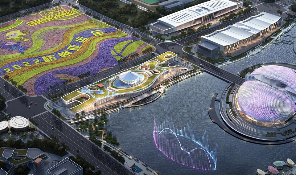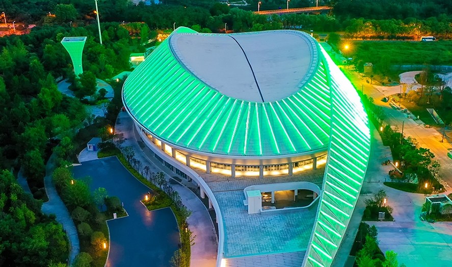 杭州奥体中心游泳馆为亚运会游泳、跳水、花样游泳项目比赛场馆及训练场馆,位于杭州市萧山区,总建筑面积53959平方米,观众席位数约6000个,是一个集游泳、跳水比赛和训练为一体的专业运动场馆。场馆拥有双馆合一的设计理念、独特的流线造型,结合双层全覆盖银白色金属屋面,和两翼张开的平台形式……作为世界上最大的两馆连接体非线性造型场馆,无论白天夜晚,颜值都超高。