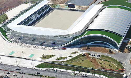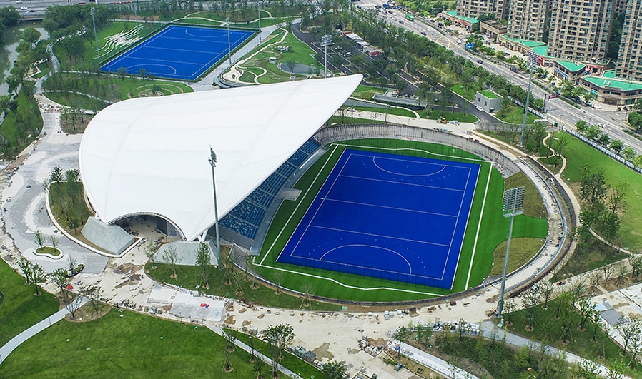 拱墅运河体育公园体育场为亚运会曲棍球项目比赛场地,位于杭州市拱墅区,在亚运村西北方向且相距约14.5公里,含主比赛场和热身场、两层赛时配套用房,赛后将作为游客接待中心使用。总建筑面积27121平方米,观众席位数4870座。