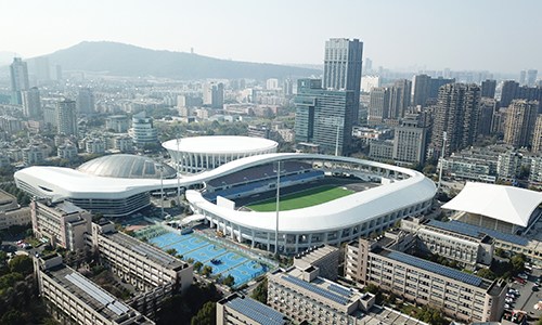 黄龙体育中心体育场为亚运会足球项目决赛场馆,位于杭州市西湖区,风景秀丽的西子湖畔,处在整个黄龙体育中心的西南侧,在亚运村的西北方向且相距约11.5公里。总建筑面积103338平方米,观众席位数51971个。
