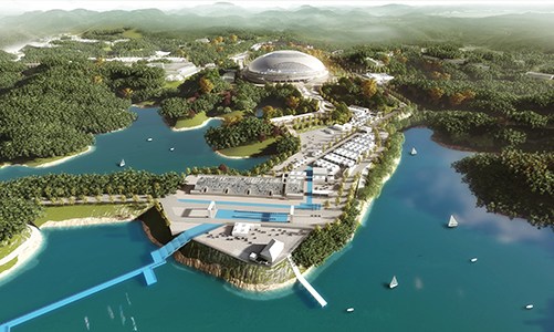 淳安界首体育中心自行车馆为亚运会场地自行车项目比赛场馆,位于杭州市淳安县界首乡,地处亚运比赛项目中心位置,场馆包含比赛及热身场馆。项目基地山环水绕,库湾众多,山体平缓,村庄零星散落,环境优美,生态优良。总建筑面积24282平方米,观众席位数3000个。